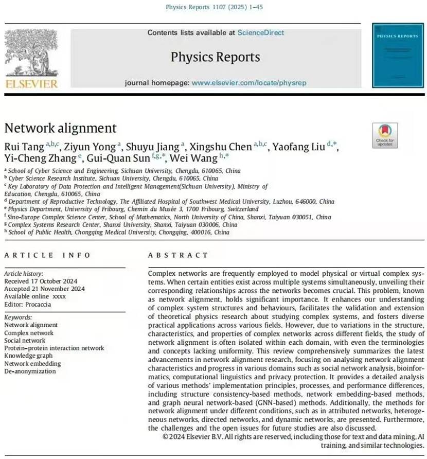 近日,新葡的京官网助理研究员唐瑞与西南医科大学、重庆医科大学合作,在国际期刊《Physics Reports》上发表题为“Network alignment”的长篇综述论文。唐瑞为论文第一作者,新葡的京集团8814检测站为第一单位。