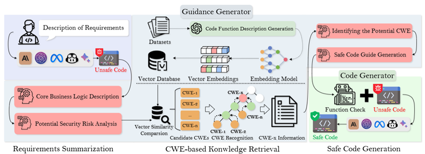 针对当前大语言模型在代码生成过程中可能引入安全弱点的问题,黄诚副教授团队在论文《Towards Secure Code Generation with LLMs: A Study on Common Weakness Enumeration》中提出了一套面向实际开发场景的安全代码生成方法体系,如上图1所示:该研究构建了基于 CWE(Common Weakness Enumeration)的任务驱动型安全数据集,并通过多标签分类方法实现生成需求与安全规范之间的更准确对应,从而在一定程度上提升了大模型对潜在安全风险的关注度;同时,该工作还提出了一套自动化的安全提示生成机制与代码规避策略引导流程,以减少对人工经验的依赖,为代码生成过程提供更加结构化的安全指引。实验结果表明,该体系在多类编程任务和不同类型的大模型上均表现出较好的适用性。